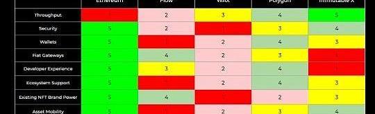 **开发者体验:**我们根据构建东西的容易程度来评估开发者体验。许多事情都会影响到这一点,如详细的文件、可用的Github仓库、所使用的编程语言、现有的工具等。以太坊居于首位,鉴于强大的EVM兼容性,Polygon紧随其后。根据我们采访的开发者,之后的排名顺序应该是Flow、WAX和ImmutableX。值得注意的是,CAIRO是一种非常新的语言,随着时间的推移,它的应用应该会越来越广。