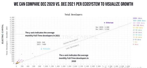 通过比较2020年12月(X轴)与2021年12月(Y轴).连接原点和生态开发者数量的线的斜率越陡,代表增长率越快。