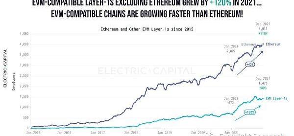 团队加速增长的一种方式是通过兼容以太坊EVM.这些兼容EVM的Layer1的增长速度比以太坊更快(+120%对比以太坊的+42%).