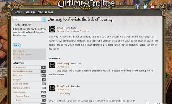 UltimaOnline还有一些其他的特殊情况,决定了它的住房危机的形状。由于我已经很久没有玩了,我采访了资深的UO玩家MaeelynDean。我也联系了UO的首席设计师RaphKoster,但他在整理的时候有点太忙了,所以只要我能够从他那里得到一些只言片语,我就自己编辑了一通。