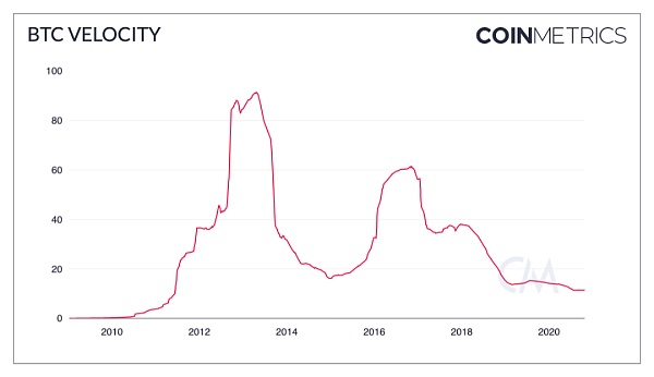 BTC的交换率也处于2011年以来的最低水平。交换率衡量的是一个平均单位的供应量在去年被转移的次数。高速度意味着相对较高的周转率。交换率下降表明BTC正趋向于被用作价值存储,而不是交易媒介。