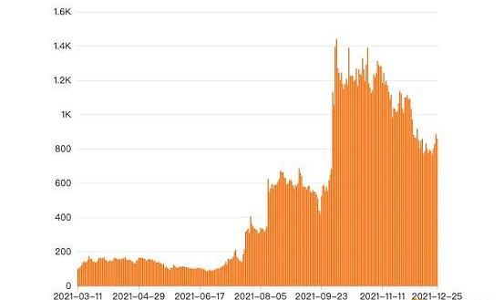 与此同时,去中心化金融市场基准利率却在持续走低,从年内最高点18.98%逐渐下降到3.81%左右。而12月美国十年期国债利率为1.46%,这与去中心化金融市场的基准利率已经相差不多。