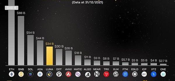 LUNA1月份的市值为3亿美元,与其他区块链平台原生代币的市值相比,排名第9。