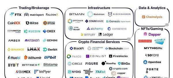 2021年,接近50家加密货币初创公司筹集了1亿美元以上的资金。从历史上看,加密货币的估值和区块链融资一直由交易所、金融技术公司和机构服务平台主导。今年的情况仍然如此,FTX、Celsius、Gemini和Fireblocks是一些最重要的融资项目。