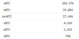 目前比特币生态的最外层就是跨链,也就是各种wrappedBTC。从DuneAnalytics的统计看,在ETH上一共有317,780个wrappedBTC资产,其中80%是wBTC。