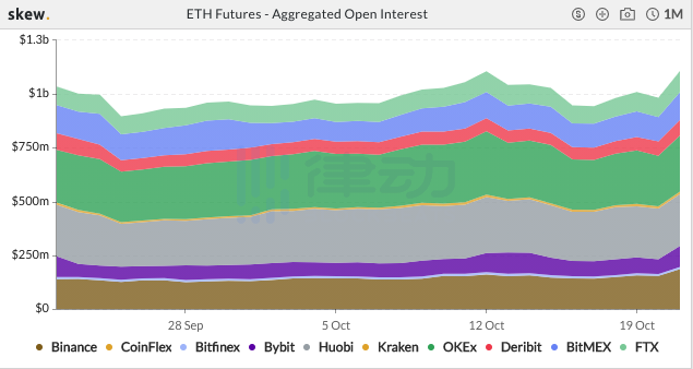 未平仓合约总量约为 11 亿美元,其中,OKEx 2.62 亿美元,火币 2.41 亿美元;