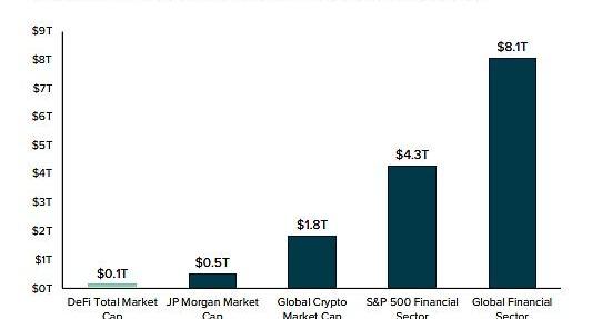 然而,与总可用市场(TAM)的市值相比,DeFi生态系统仍处于早期阶段,其总市值仍然只占全球金融服务行业8万亿美元市值的约1.6%,仅摩根大通的市值就几乎是整个DeFi生态系统规模的5倍。但DeFi仍有巨大潜力通过吸收传统金融业的份额实现增长,并在价值近2万亿美元的加密经济中增加份额。