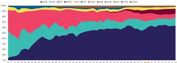 14、绝大多数交易量以法定货币或稳定币计价。以比特币计价的交易对现在仅占总交易量的7.5%——与往年相比发生了巨大变化。