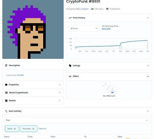 2021年11月8日,林俊杰花费125?ETH买入8601号CryptoPunks。