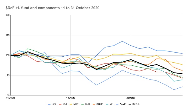 图4:2020年10月11日以来$DeFi+L和成分token的表现情况
