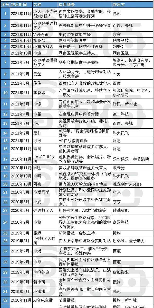 百度、华为、阿里等都纷纷引入AI数字人入职,担任技术宣讲员、形象代言人;OPPO、小米接连宣布其智能语音助手的虚拟形象;腾讯联合搜狗一口气推出了五款数智人,为企业定制智能客服、数字员工;科大讯飞、华为、OPPO、英伟达等都推出了虚拟人生成或交互平台……