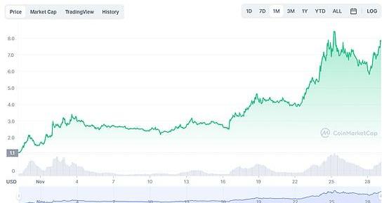 TheSandbox作为当下整个元宇宙市场最亮眼的存在,其通证Sand币价在短短一个月,就由1.1美元上升并突破了8美元,实现数倍的增幅。
