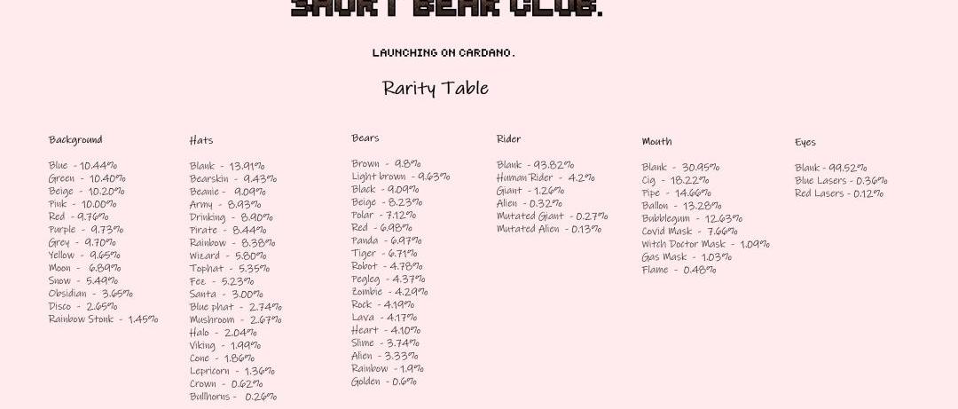 特征稀有度:衡量每个特征的出现频率,即拥有该特征在此集合中的占比。例如,特征"Background_Blue"的稀有度得分是10.44%,因为ShortBearClub总数是5000只,其中有522只"Background_Blue"熊。