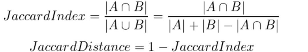 Jaccard距离是一个统计学的方法,用于测试样本集之间的不相似性,范围为从0到1。其数学公式为: