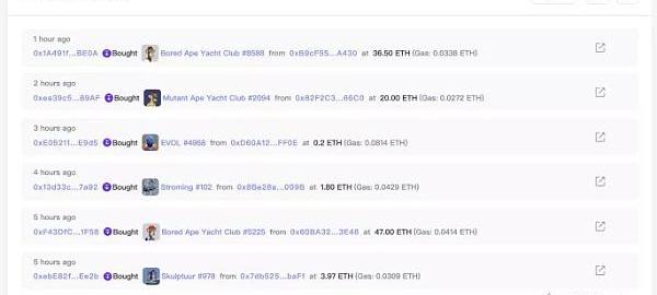 根据nftgo.io数据,有14位巨鲸在过去的7天内买入了CryptoPunks;0x3AC2Cc.....9247在28分钟以前以1ETH的价格买入了Doodle#9600,在52分钟前花费0.9499ETH购买了Doodle#6893,在1小时前花费0.28ETH买入Head#9264等等。