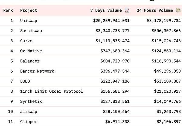 Dex即去中心化交易所,是DeFi生态的最核心部件。Dex七日交易量用于判断DeFi的生态活跃度。