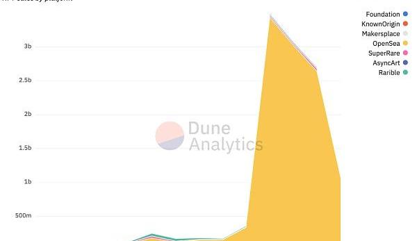 NFTMarketplace交易量用于反应NFT交易市场热度,是衡量NFT发展的一个重要指标。