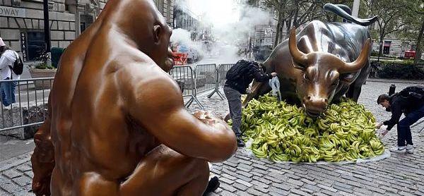 大猩猩哈拉比的雕像出现在华尔街冲锋公牛的对面,模因变成了现实生活,现实生活变成了一个模因。