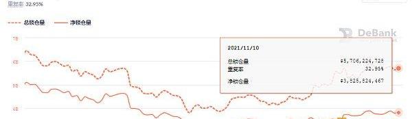 Ethereum链上DeFi锁定资产前十排名及锁仓量,数据来源:Debank