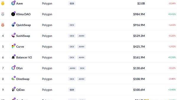 Polygon链上DeFi锁定资产前十排名及锁仓量,数据来源:Debank