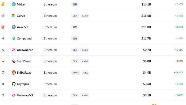 Ethereum链上DeFi锁定资产前十排名及锁仓量,数据来源:Debank