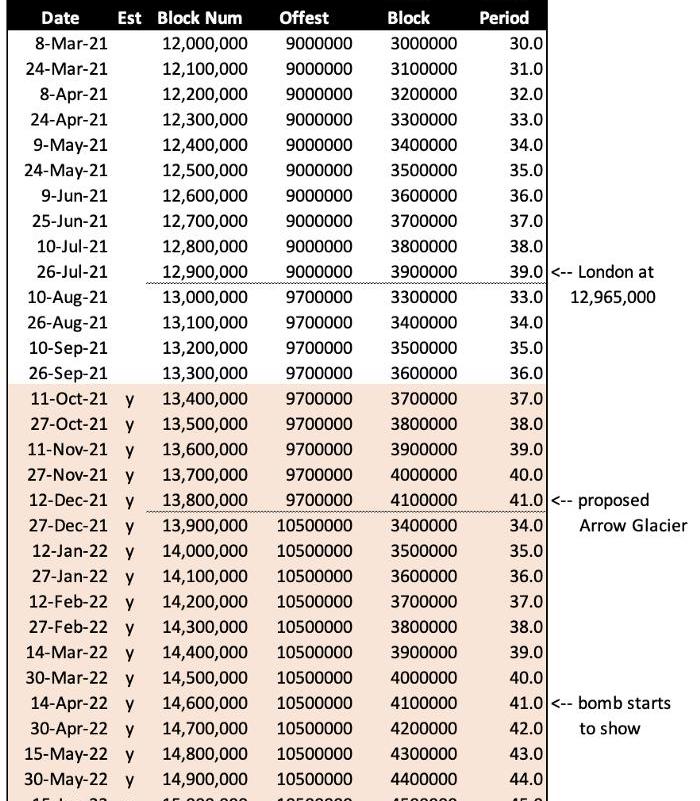 你可以从上面这张图看出,无论我们早点还是晚点实施“ArrowGlacier”硬分叉,只要我们使用10500000的偏移量,那就对下一次难度炸弹爆炸的时机没有任何影响。