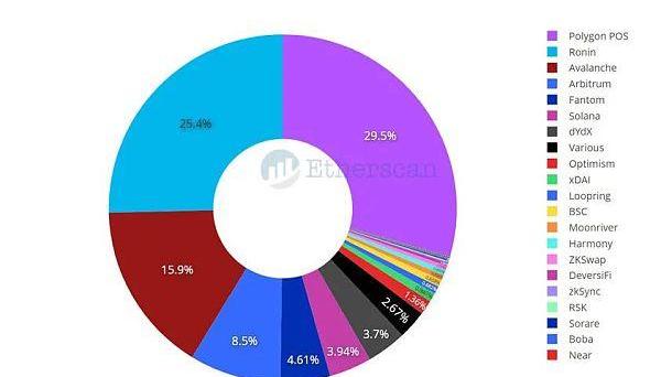 与之前看到的全紫色相比,这次桥上的平衡分布得更好。Polygon的份额从大约90%下降到约30%。事实证明,AxieInfinity迁移到他们的Ronin侧链已被证明是一个巨大的成功,活动的爆炸式增长和AXS代币价值使他们获得了25%的桥锁价值。Avalanche和Arbitrum位列前四。