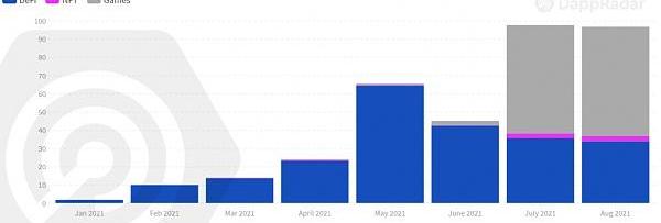通过分析最近几个月推出的新Dapps,游戏类别的数量明显增加。自6月以来,NFT和游戏Dapps一直在上升。另一方面,DeFiDapps的推出明显减少。尽管如此,数据证实区块链行业Dapp的使用量正在增加。