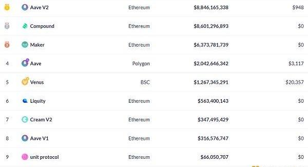 DeFi项目锁定资产前十排名及锁仓量,数据来源:Debank