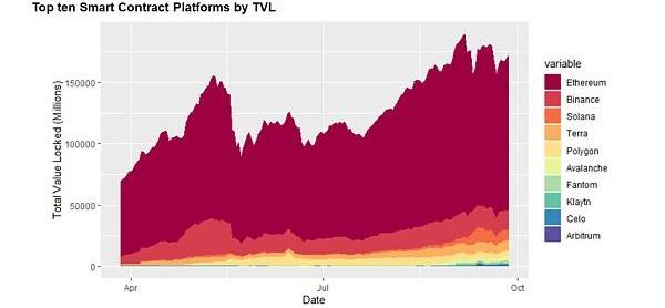 上图:总锁仓价值(TVL)排名前十的智能合约平台,数据截至2021年9月27日