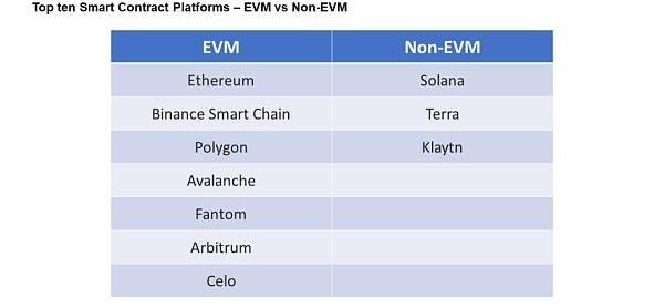 上图:TVL排名前十的智能合约平台中,兼容于EVM的平台(左)和不兼容EVM的平台(右)。