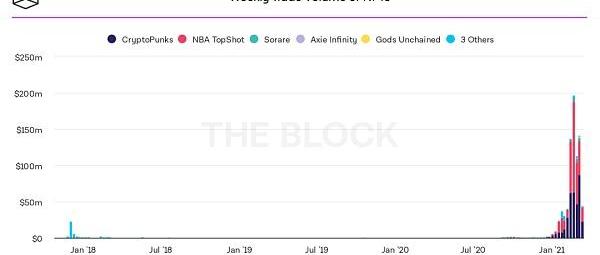 上图清楚地显示了加密朋克、NBATopShot和其他NFT平台的数量激增。在今年的NFT热潮中,一些古早NFT售价高达1000万美元以上。