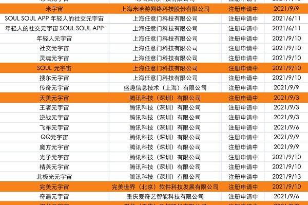此外,还包括米哈游“米宇宙”、咪咕“咪咕元宇宙”、完美世界“完美元宇宙”、祖龙游戏“祖龙元宇宙”等以公司名+元宇宙的形式,进行商标注册申请。