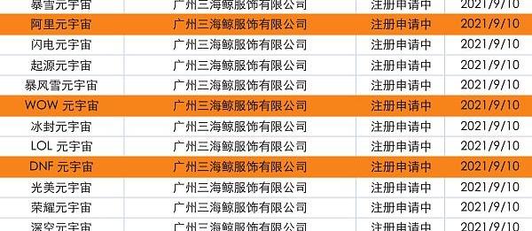 例如在9月10日,一家名为广州三海鲸服饰的公司申请注册了12个元宇宙相关商标,且多数商标一眼就能看出有“碰瓷”的意思。