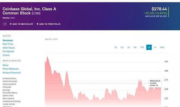 但,Coinbase上市后的股价走势,给狂热的市场情绪,降了温。Coinbase在纳斯达克上市首日,开盘交易价为381美元,收盘价约为328美元。尽管较开盘前纳斯达克市场设定的参考价格涨逾约31%,且两天后涨至最高约345美元,但好景不长,随着CoinbaseCEO和公司相关投资人于上市首日抛售价值约40亿美元的持股的消息被放出后,这种急于释放数字财富的蜜汁操作,让Coinbase的股价一周左右跌落到最低约282美元。从K线走势图看,Coinbase的股价在5-8月基本处于“躺平”状态,没有较大的上涨和回落,从8月中下旬开始,有了上升起色。