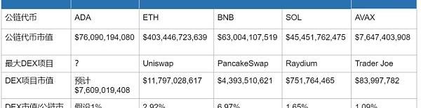 在Cardano上建立Defi生态可以说是最近加密货币世界最让人兴奋的事情了,而去中心化交易所则是整个Defi生态的基石,下面的表格梳理了几条主流公链以及其主要交易所市值的比较: