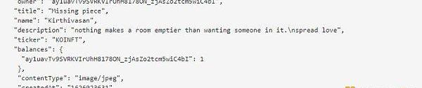 Koii原子NFT对象存储在SmartWeave合约的状态中。每个NFT都有一个所有者、标题、艺术家姓名、描述和其他元数据,使周围的代码能够执行其功能: