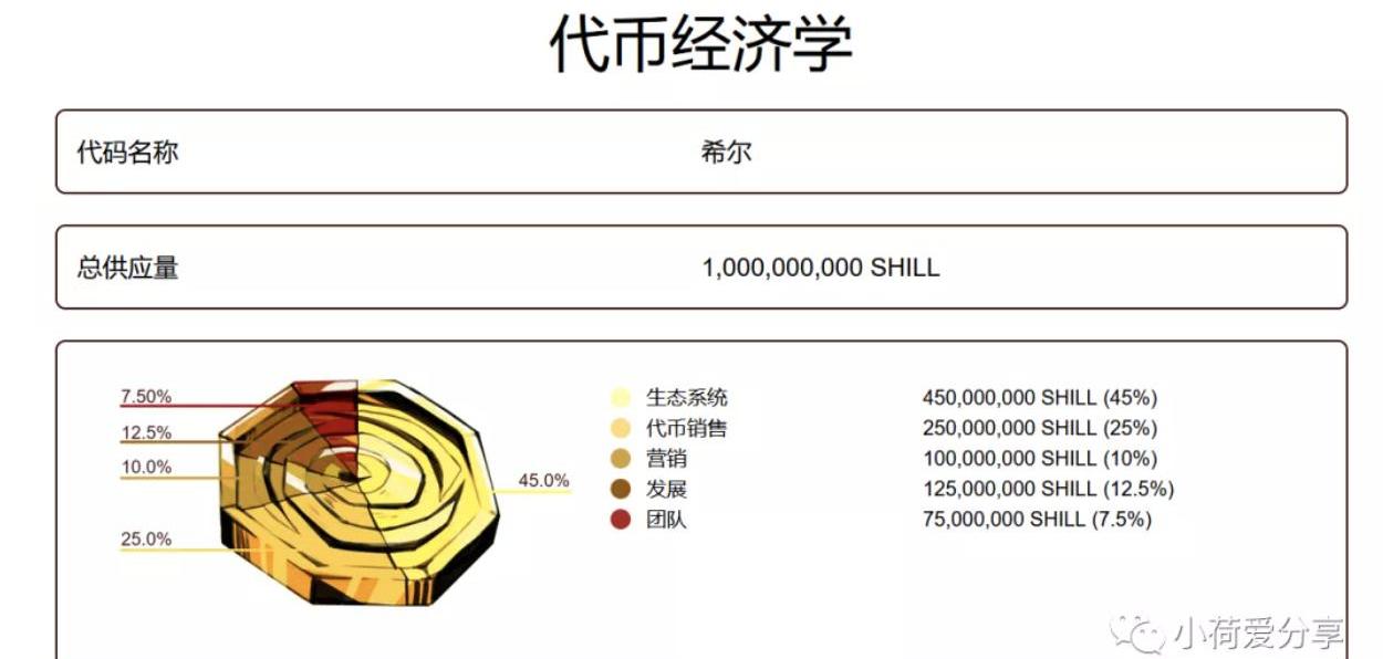 ProjectSeed的代币SHILL是游戏生态系统的实用代币,其中包括游戏内货币、注和游戏奖励。总量10亿枚。生态系统45%、代币销售25%、营销10%、发展12.5%、团队7.5%。