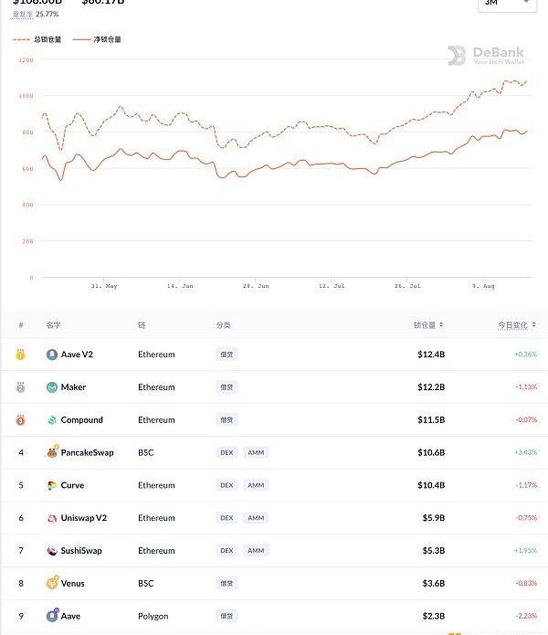 DeFi项目锁定资产前十排名及锁仓量,数据来源:Debank