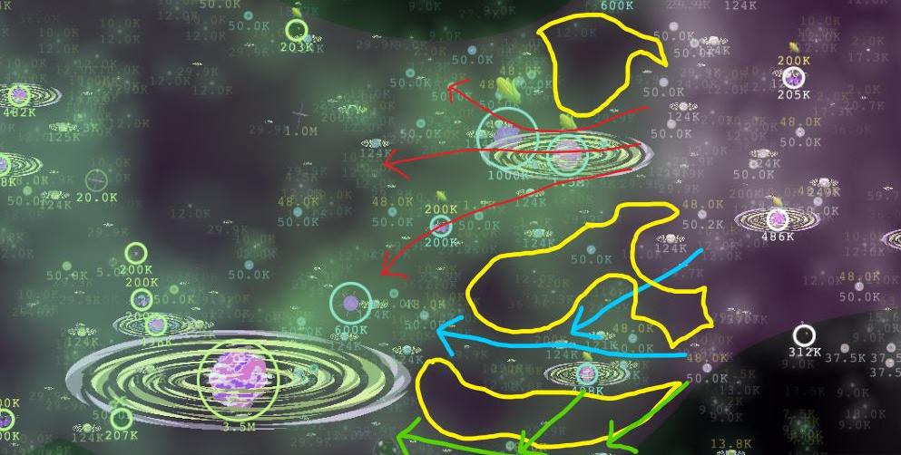 再次确认行星空隙,我们可以看到,对于这场战争的南北双方来说,没有太多的东西可以支持双方,这两方单独行动时都相当恼人。对于蓝色区域内的北侧,由于那里大部分较大的行星存在时空裂缝,整体行星防御和能量再生相当低。还有几个4级行星将远离前线,但更靠近北方行星。对于南侧,有一条3级行星的细线,一旦橙色圆圈内的任何支撑被切断,就很容易被封锁。一旦南北双方至少有了较量,凹面就不复存在,主战将沿着红线展开。