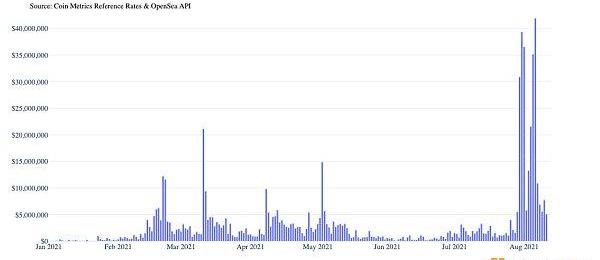 在过去两周,NFT的销售量激增,远远超过了3月份的NFT热潮。最大的NFT市场OpenSea的交易笔数在上周达到每天超过6万的峰值,接近3月份峰值的8倍。OpenSea的交易量在8月份已经突破了10亿美元,每日独立买家的数量也创下了历史新高。?