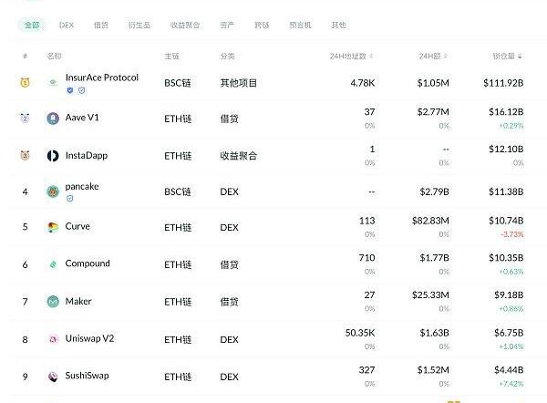 DeFi项目锁定资产前十排名及锁仓量,数据来源:Debank