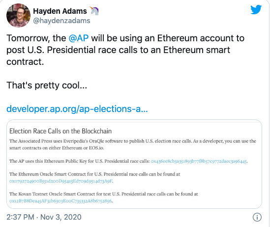 10 月 15 日,美联社宣布与区块链百科全书项目 Everipedia 达成合作,以将 2020 年的选举结果记录在 Everipedia 区块链数据库中。具体而言,将有 7000 多个州和全国选举电话被记录在区块链上,并通过可公开访问的用户界面显示结果。据悉,Everipedia 的数据库运行在 EOS 之上,Chainlink 是美联社数据和 Everipedia 之间的中介。
