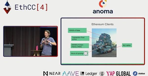现在的以太坊客户端是非常重型的软件,它需要几百GB的磁盘空间,你的cpu要运转非常长的时间来同步数据。但这不是客户端团队的工程能力问题,而是由我们的网络协议决定的。我们的网络协议是DevP2P,是一个点到点的网络,其中一个协议叫"ETH",也是所有以太坊客户端所在的地方。