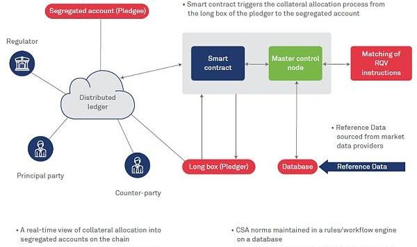 在基于区块链的抵押品管理解决方案中,分配逻辑编码在智能合约上。该合同将包含主要与监管机制有关的规则。像信用支持附件条款和条件这样的私人规则,由于其易变的性质,将在私人规则引擎上脱离链条。智能合约将与多头箱和隔离账户头寸进行交互并完成分配。分配的抵押品头寸实时保存在分布式账本上,各方和监管机构都可以查看。这将有助于释放具有三方代理的账户持有人的多余抵押品进入流通,为各方创造更多的流动性和抵押品优化。
