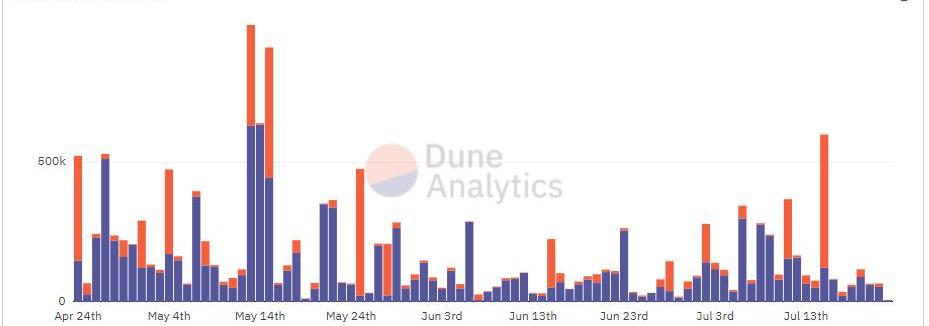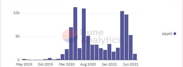 Opensea是全球最大的综合性NFT交易平台,涉及的NFT包括艺术、音乐、域名、体育等。同时,Opensea还提供有免gas手续费铸造、出售NFT的服务,这一点在市场鹤立鸡群。根据DuneAnalytics上的数据,2021年2月之前,Opensea上的NFT交易一直不温不火。来到二月份,NFT市场整体交易量呈现爆炸式增长,Opensea也不例外。整个二月份,Opensea的总交易额相比一月增长了十倍以上,达到了9500万美元以上,总交易NFT数增长了四倍,达到4万余件,活跃用户增长了一倍,为15000余人。随后,伴随着NFT市场的火爆,Opensea的热度也始终保持在较高水平,于5月4日达到了单日交易额2300万美元的最高纪录。