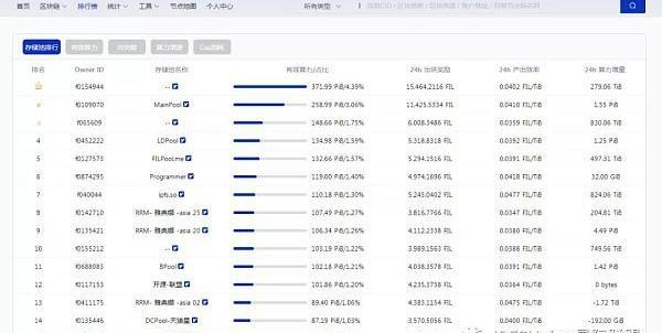 飞驰浏览器本次新增了存储池排行的功能,里面详细展示了排名、OwnerID、存储池名称、有效算力/占比、24h出块奖励、24h产出效率、24h算力增量等数据。