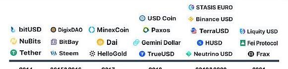 TetherUSD是最早一批发行的稳定币。2014年7月,Tether公司推出RealCoin,并于11月更名为USDT,1USDT锚定1美元。USDT于2015年2月开始在交易所交易,是当年在交易所上市的第一批稳定币,此后逐渐成为市场上交易量最大使用最广泛的稳定币,主要用于加密货币现货、期货交易对。USDT是第一个由美元资产支撑的稳定币,公司称每枚代币都有1美元资产支撑,但实际上Tether的资产负债表并未得到可靠的审计。2015-2017年发行的稳定币项目还有BitUSD、NuBits、BitBay和Steem等。