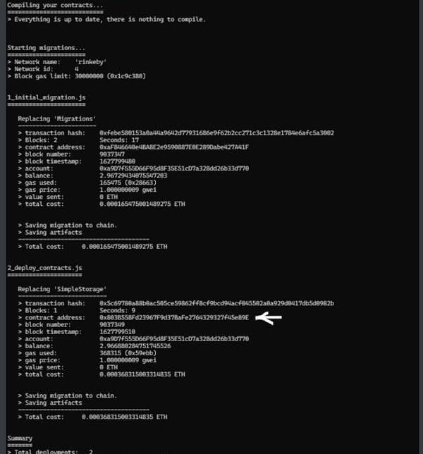 然后部署合同。部署后复制simplestorage的地址,替换为verifyingContract下app.js第76行的地址。
