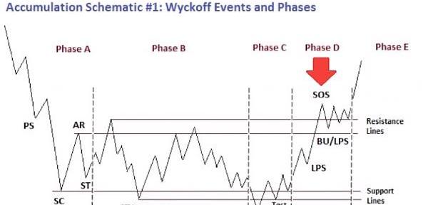 在积累模式的D阶段,价格终于开始反弹,有时会在所谓的最后支撑点或称LPS中修正一次或多次。
